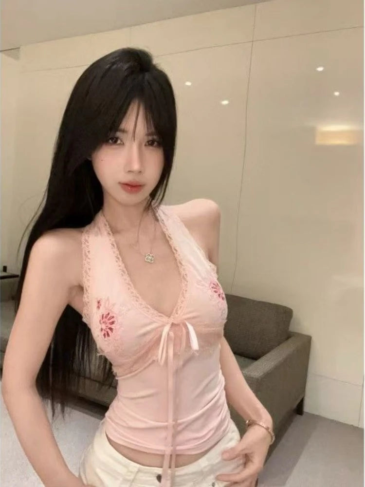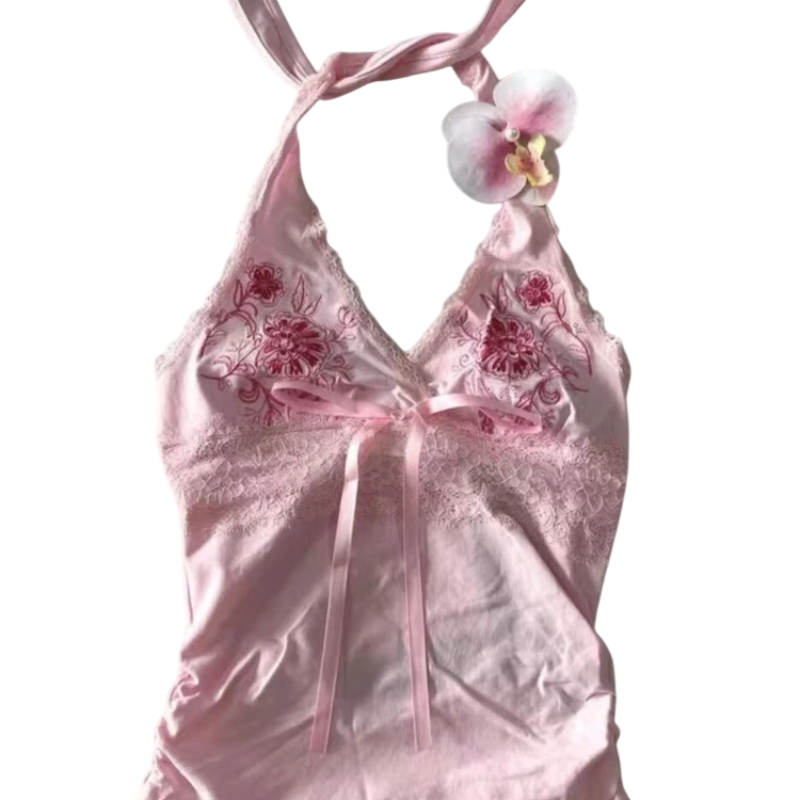 This delicate pink halter top combines feminine charm with elegant details. Featuring floral embroidery on the bust and a lace trim underbust band, it creates a romantic and flattering look. The adjustable halter neckline ties around the neck, while a satin ribbon bow at the front adds a sweet finishing touch. Crafted from a soft, lightweight fabric, it offers comfort with a touch of sophistication.