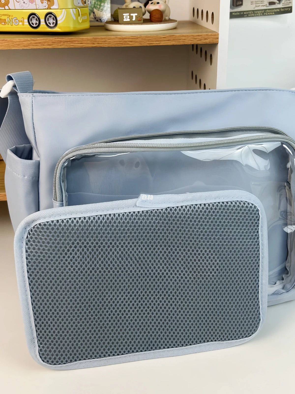 Perfect for students and lovers of cute fashion! This adorable Transparent Ita bag features a spacious design with multiple compartments, adjustable straps, and a transparent front pocket.